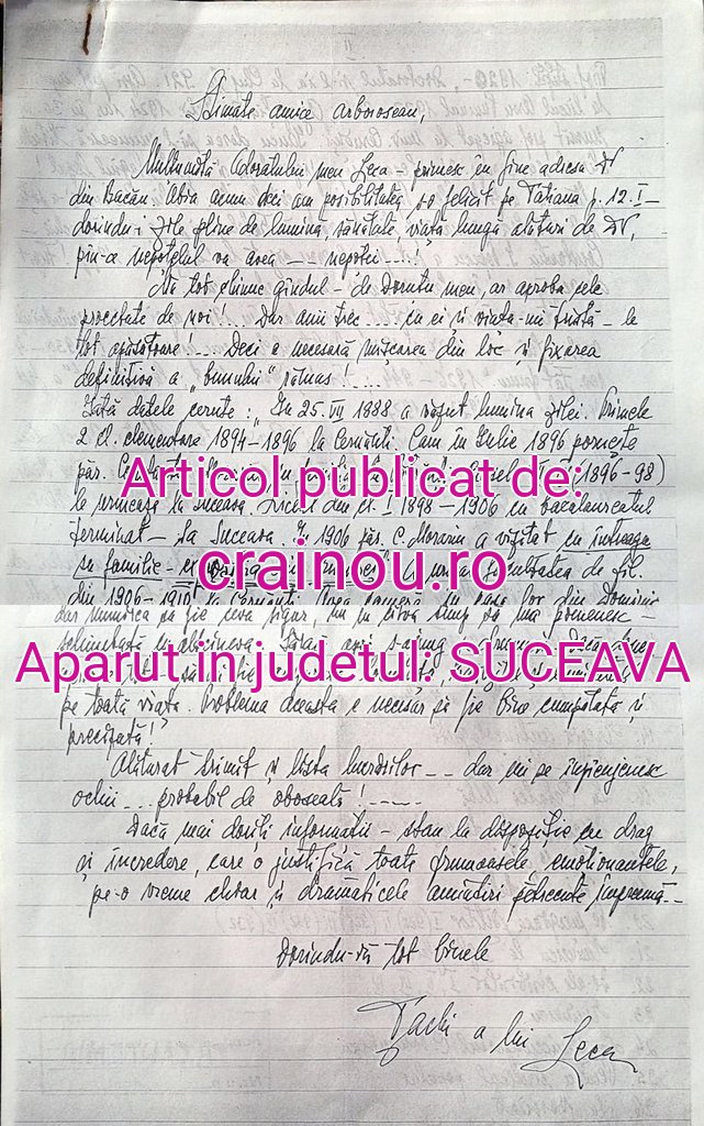Îi dedicăm scrisoarea de mai jos – ca şi o copie xeroxată a originalului – Doamnei Farm. Maria Olar, vrednica păstrătoare a amintirii familiei cu mari merite pentru Bucovina – prin Fundaţia Culturală „Leca Morariu” – care se pare că ne mai pregăteşte surprize atractive legate de viaţa şi trăirile sufleteşti ale devotatei tovarăşe de viaţă şi de preocupări literare a profesorului universitar Leca Morariu.