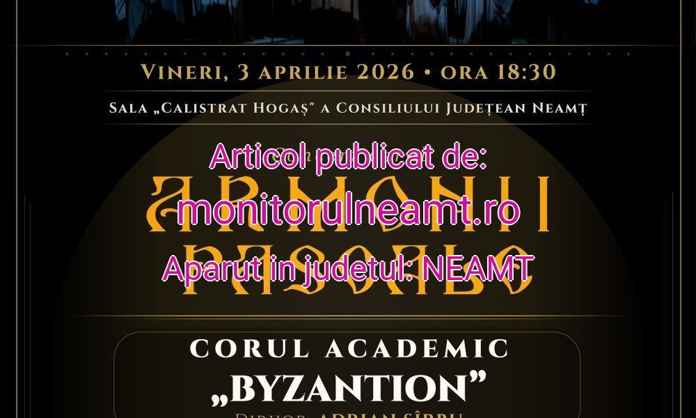 Concert de Florii la Consiliul Județean Neamț . Centrul pentru Cultură și Arte „Carmen Saeculare” Neamț invită publicul vineri, 3 aprilie, de la ora 08.30, să participe la evenimentul special prilejuit de concertul Corului Academic „BYZANTION”, ansamblu aflat sub conducerea muzicală și artistică a dirijorului Adrian Sîrbu.