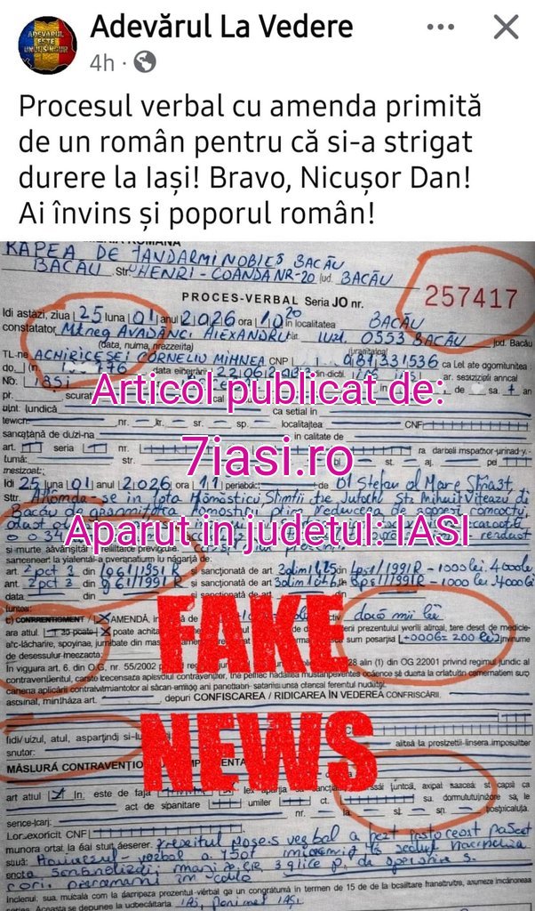 Forțele din cadrul MAI au aplicat mai multe amenzi la Iași pentru tulburarea ordinii și liniștii publice. Cu toate acestea, un astfel de proces-verbal a fost modificat cu ajutorul inteligenței artificiale și distribuit pe diferite rețele sociale pentru a stârni furia oamenilor.