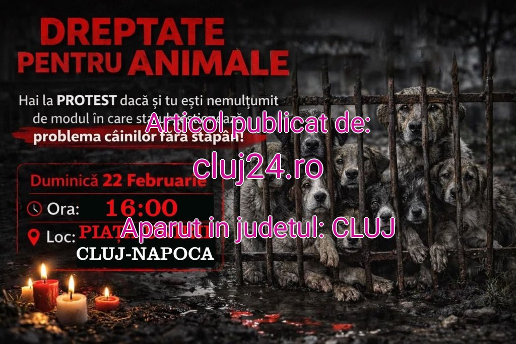 Clujenii sunt chemați duminică, 22 februarie, între orele 16:00 și 19:00, în Piața Unirii, la un protest organizat sub mesajul „Dreptate pentru animale”. Evenimentul vine în urma scandalului izbucnit la adăpostul de câini din Suraia, județul Vrancea, unde peste 15.000 de animale ar fi fost eutanasiate în ultimii ani fără anestezie.