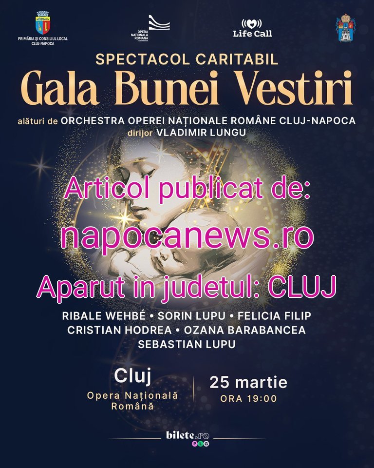 Muzica psaltică și vocal-simfonică se întâlnesc într-un spectacol caritabil în care generozitatea devine sprijin concret pentru femeile însărcinate în situații vulnerabileMiercuri, 25 martie 2026, de la ora 19:00, Opera Națională Română Cluj-Napoca găzduiește prima ediție clujeană a spectacolului caritabil Gala Bunei Vestiri, organizat de Asociația Life Call.